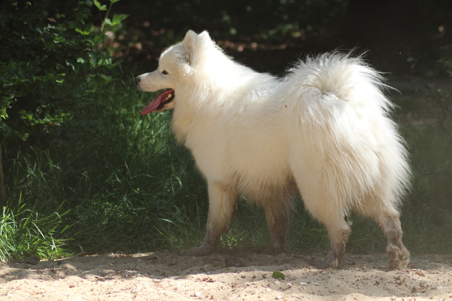 Gefokt voor: Hij komt uit Siberië. Hij werd daar gebruikt om de slee te trekken, om op rendieren te jagen en om de mensen daar warm te houden. De karakter eigenschappen lijken nog steeds erg op de oerhond, die nog steeds heel goed tegen hele koude klimaten kan en een lief karakter heeft. Hij komt uit Noord-Europa en een gedeelte van het Azische poolgebied dat een groot gedeelte in Noord-Siberië is. Dat loopt langs de Witte Zee naar het oosten tot aan de rivier Jenissei dat in het Russisch Mongolië ligt. Een ontdekkingsreiziger had het in het journaal al over een witte hond die de slee moest trekken. Dat was in 1696. Later waren er ook andere ontdekkingsreizigers die het over deze honden hadden. Ze gaven allemaal hun eigen mening over de kleur, grootte en karakter. De stamvader was een Chocolade bruine hond dat de eerste was die de ‘Samoyed’ werd genoemd. Hij dekte de teef Whitey en zij kregen het eerst Samoyed nestje. Er werden steeds meer honden uit Siberië gehaald, en zo zijn er meerdere honden geweest die de naam Samoyed kregen en zo is het ras begonnen. In het Nederlands is het Samojeed, maar er zijn heel veel namen voor deze hond. In Nederland is Samojeed het meest bekend, en in Amerika en andere Engels talige landen noemen het de Samoyed. Er werden meerdere verschillende honden vanuit Siberië geïmporteerd naar Engeland, en van dat punt zijn ze begonnen om een rasstandaard te beginnen. Op deze manier is er in 1909 een Kennelclub gestart en daaruit is het rasstandaard bekend geworden over het karakter en kleuren van dit ras. In 1924 werd de eerste Samojeed in Nederland ingeschreven in het stamboek die uit de kennel kwam van de eerste fokker van de Samojeed. Er werd uit Noorwegen een Samojeed geïmporteerd voor Prinses Wilhelmina
