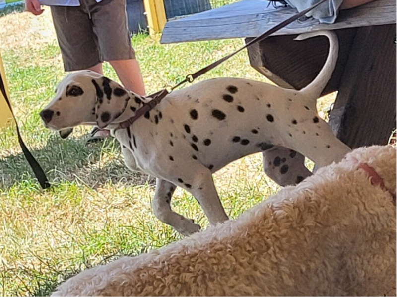 Kleur: Helemaal wit met zwarte spikkels, of helemaal wit met bruine spikkels. De spikkels zitten echt overal. Zelfs op de buik en in de bek. De stippen kunnen er een paar zijn, maar ook er tussenin en tot heel erg veel. De puppies worden helemaal wit geboren